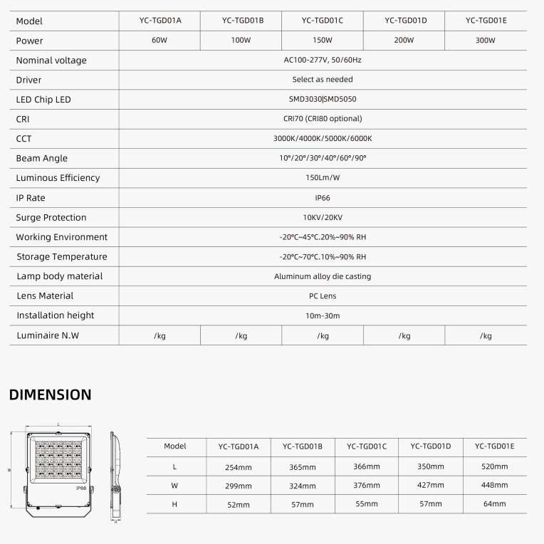 | YC-TGD01-50W | 358*294*52 | 50 վտ | Heat sink Aluminum body,Glass,Bracket,304 screws, PCB, Ոսպնյակներ: |