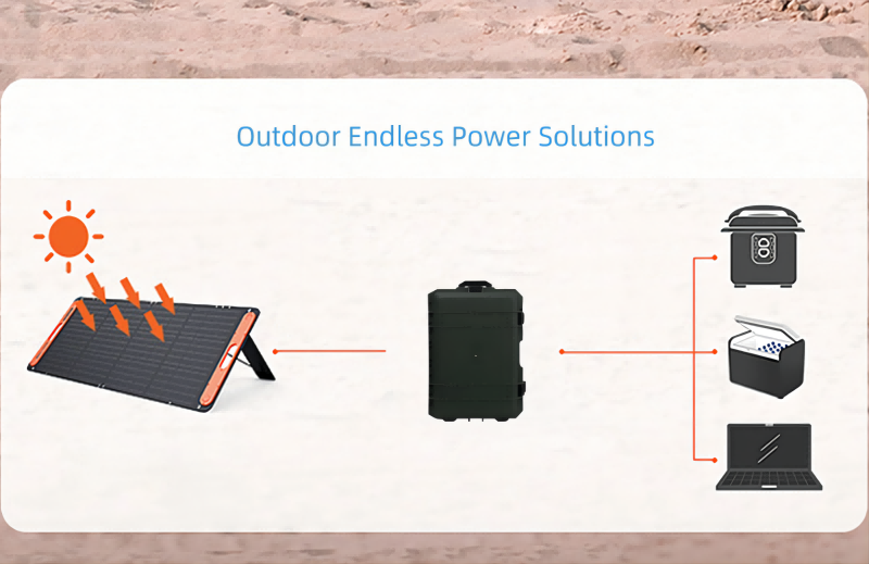 Արևային ծալովի վահանակը սովորաբար բաղկացած է բարձր արդյունավետությամբ արևային վահանակներից, ներկառուցված մարտկոցից, լիցքավորման կարգավորիչից և ելքային միջերեսից: Արևի լույսի ազդեցության դեպքում արևային մարտկոցները էներգիան վերածում են էլեկտրական էներգիայի և այն պահում ներկառուցված մարտկոցում: Լիցքավորման կարգավորիչը օգնում է կարգավորել լիցքավորման գործընթացը և ապահովում է, որ ձեր սարքերը ստանան կայուն և արդյունավետ լիցքավորում: